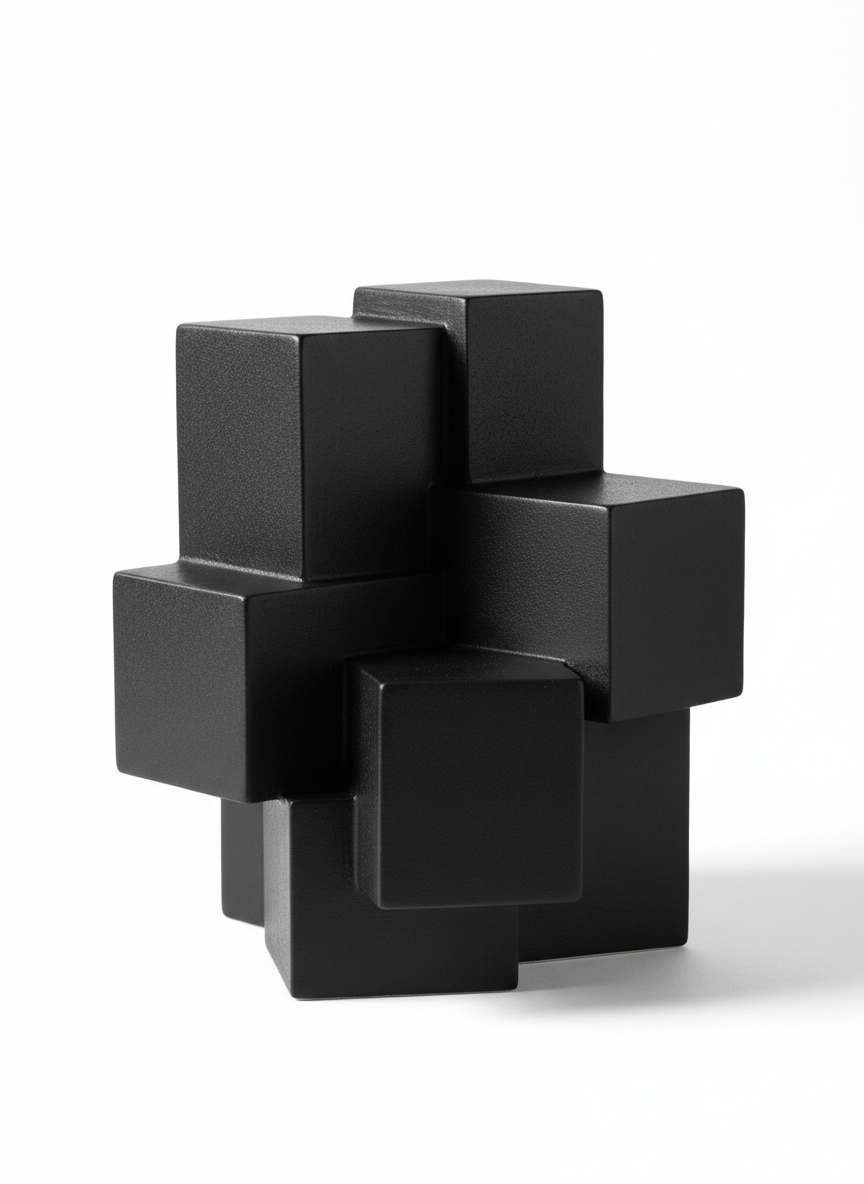 Three cubes intersect at sharp angles. The porcelain is dense and has a matte look. Every corner is pointed. It stands upright on any flat area. The weight is centered. It does not show fingerprints. The surface has a gritty texture. It occupies a square space. The material is heavy for its size.